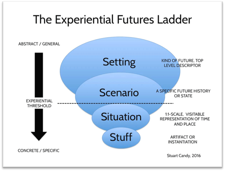 By taking an extended wander through multiple futures, participants were able to vividly explore the minutiae of those worlds in sometimes unsettling or delightful detail. And this is by design. It’s precisely the personal sense of being unsettled or delighted through exploration of the vivid details of a future world that produces a shift in perception that allows for a reimagining of what’s possible. Participants imagine what could be, only to find that seeds of that very future already exist in the here and now. Suddenly, what had been unthinkable becomes thinkable. What was far-fetched is reperceived as an adjacent possible, which was barely a hop, skip and a jump away from the present moment. As they emerge from a scenario exercise, people perceive with new clarity the evolutionary potential of the present, and with it, a new sense of their own agency as stewards of that potential.